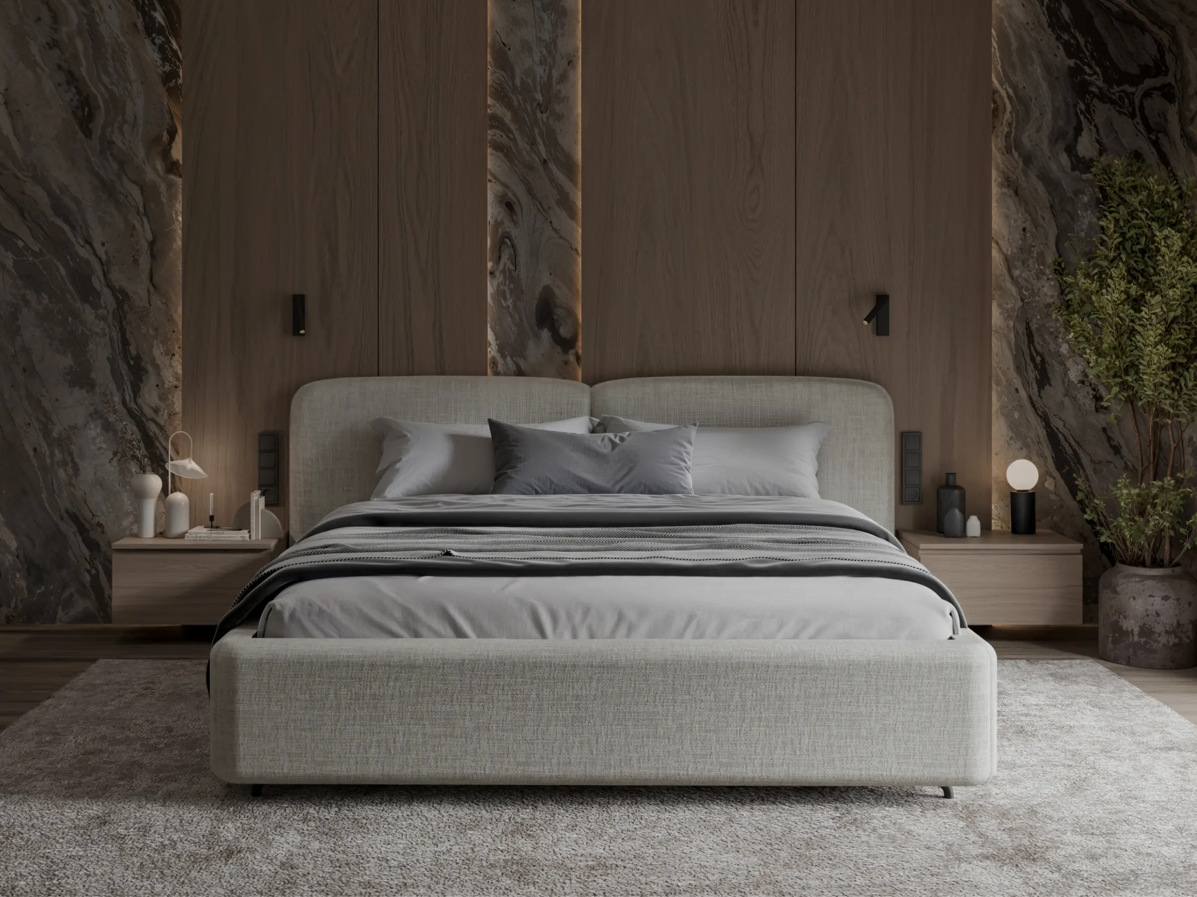 Opcje tapicerowania: Łóżko dostępne jest w dwóch wersjach wykończenia: w całości w tkaninie, w całości w skórze naturalnej.