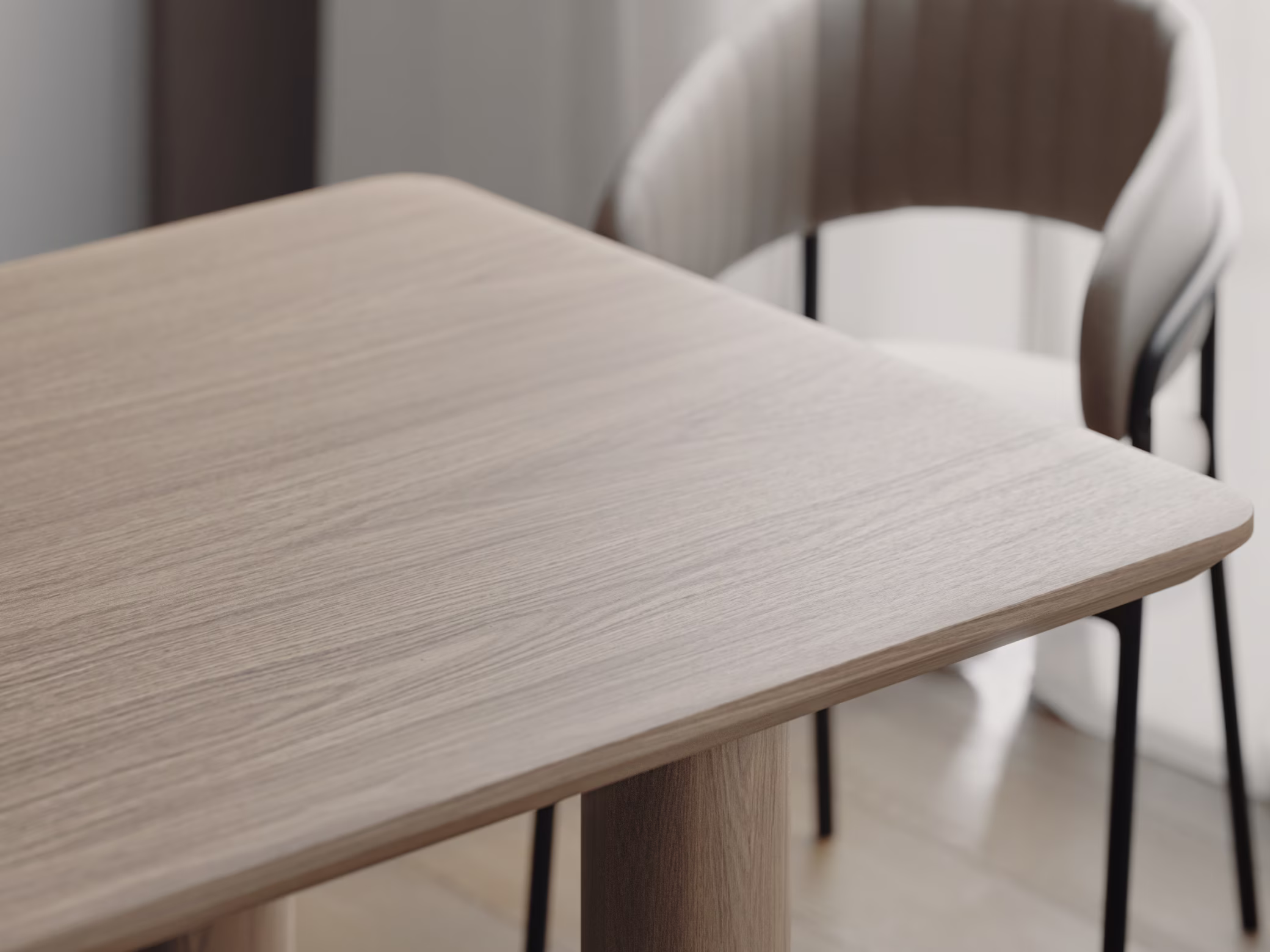 Materiał blatu: Naturalny obłóg dębowy (1.5mm) na rdzeniu z płyty drewnopochodnej, zapewniającej stabilność wymiarową.